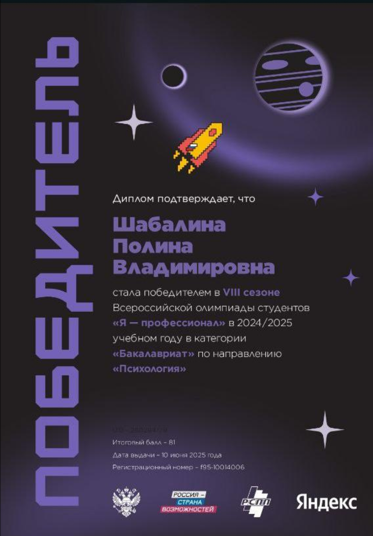 Поздравляем Полину с блестящей победой и желаем ей дальнейших успехов и новых достижений на профессиональном пути!